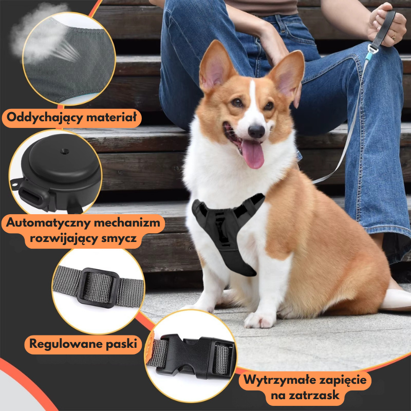 Dzięki wbudowanej rozwijanej smyczy pies ma przestrzeń do ruchu, a Ty zachowujesz kontrolę w każdej sytuacji – bez stresu i szarpania.